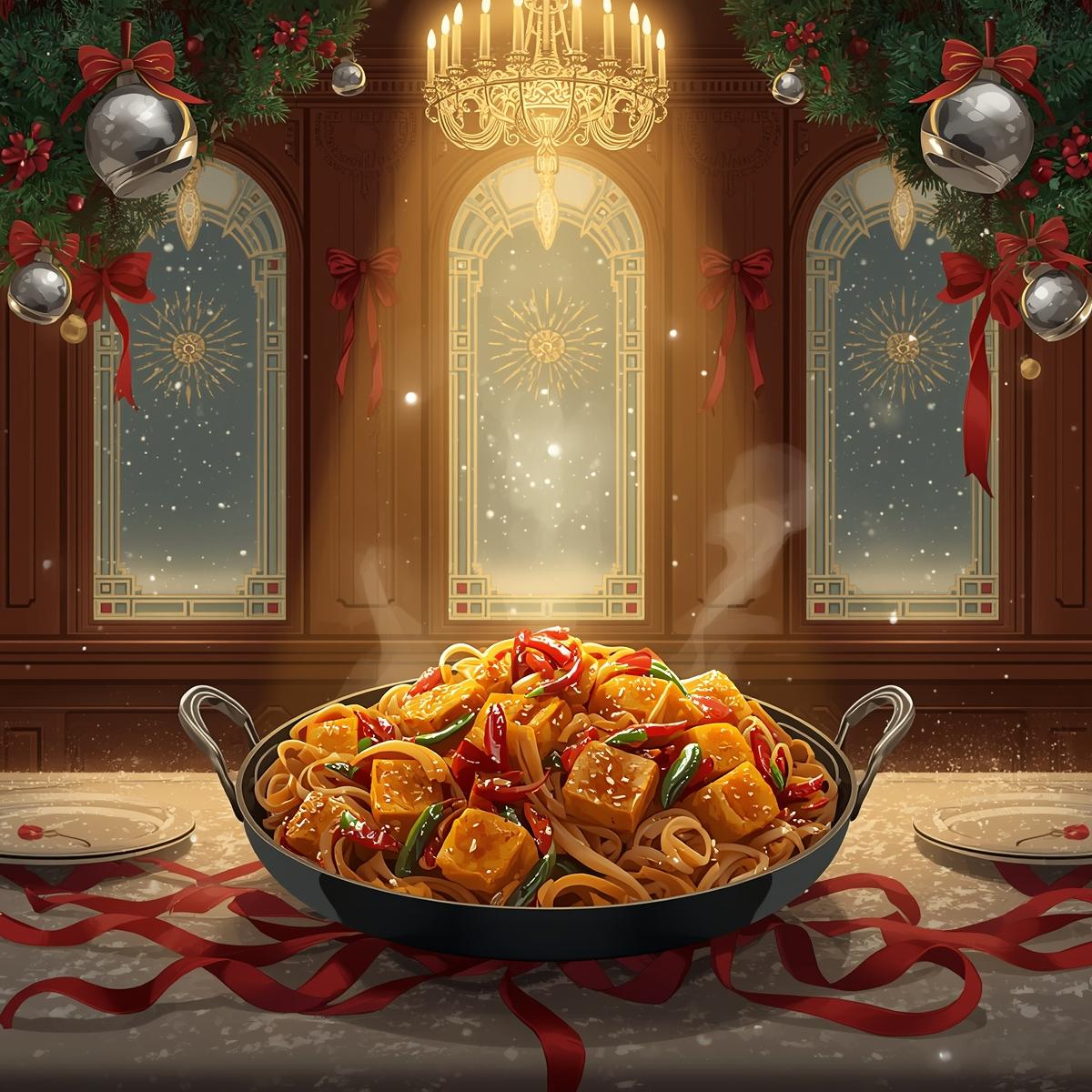 Our Holiday Kung Tso Stir Fry blends the bold flavors of General Tso and Kung Pao into one festive entree. Extra Firm tofu is marinated in plant based yogurt, paprika, garlic, and liquid aminos, then baked until golden. it’s tossed with noodles and Stir fried vegetables in a scratch made sauce of veggie broth, maple syrup, rice vinegar, hoisin, garlic, ginger, peppers, hot sauce, sesame seeds, and a corn starch slurry for the perfect glossy finish. Packaged in a compostable half pan container, this dish serves 8-10 as a centerpiece entree or 12-14 as a side for holiday gatherings.